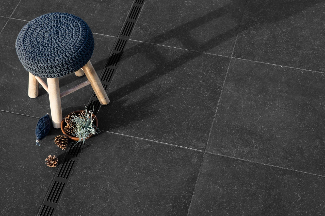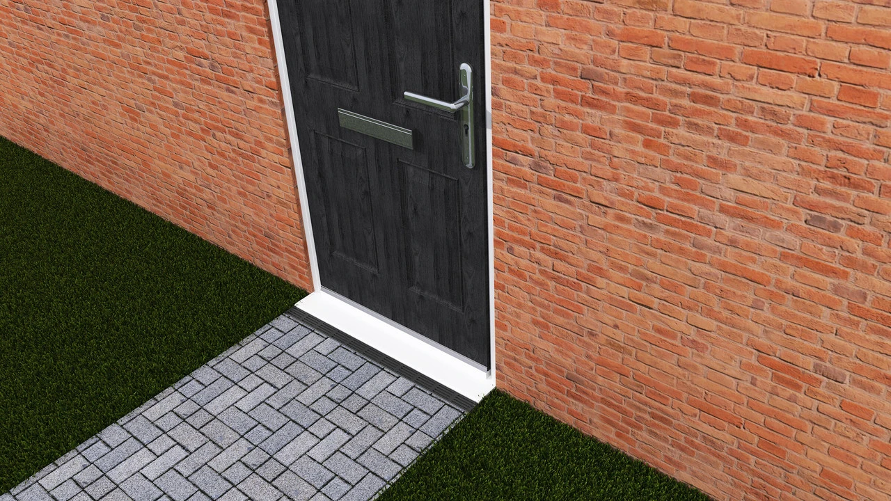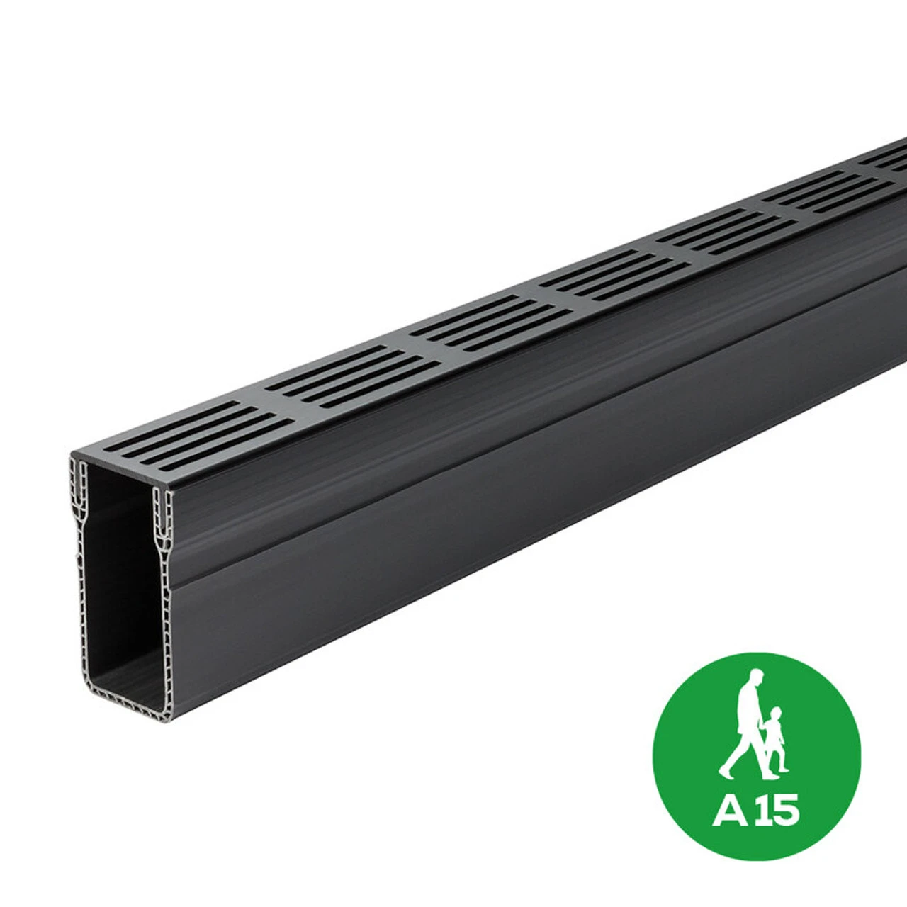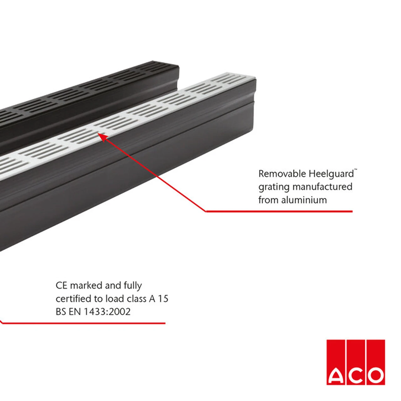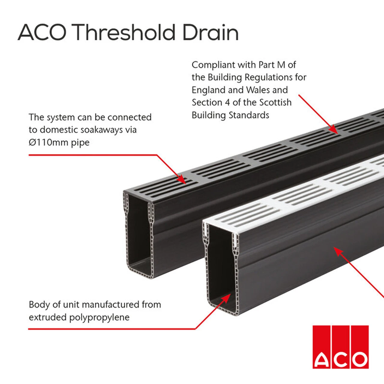 ACO Threshold Drain Drainage Channel Assembly with Black Aluminium Grating 1000mm A 15. Manufactured from extruded PVC and aluminium, eliminates water ponding at house entrances. ACO Threshold Drain comes complete with a black aluminium Heelguard grating suitable for pedestrian traffic. The discreet system has a width of 60mm and is available in 1m lengths. The system is compliant with Part M of the Building Regulations for England and Wales and Section 4 of the Scottish Building Standards.