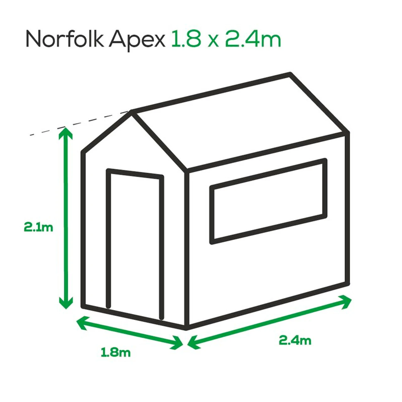 The 2.4m x 1.8m Norfolk Apex Shed is the best-selling shed in the Albany Apex roof shed range. This shed is constructed from tongue and groove shiplap even the floor and roof! Shiplap is advantageous as it allows water to run off it, this can increase its waterproof ability and will prevent draughts from penetrating between the boards. This shed is supplied with quality polyester roofing felt. The door is fully framed and braced, with three hinges. This shed has two windows side-by-side which allows in lots of natural light. The window side can be either the left or the right-hand side. The framing on this sturdy shed is 45mm x 34mm. There is a single door and it locks by lock and key. We recommend treating timber sheds within 6 months of installing. As with all timber products, regular treatment and maintenance is advised. Remember that you need a good solid base for your shed, check out our advice page for more info.