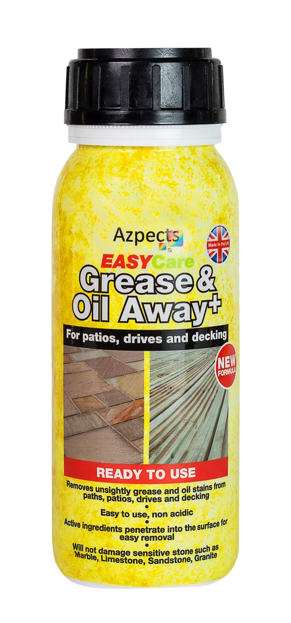 Remove unsightly oil and grease stains. Grease & Oil Away+ is a simple to use, professional-grade cleaner to remove engine oil, grease & oily stains from drives, patios and decking. It contains deep penetrating active ingredients to ensure penetration below the dirt and stains, making removal easy. It can be applied straight from the bottle on concrete and natural stone and will not damage sensitive materials such as Marble, Limestone, Sandstone and Granite.