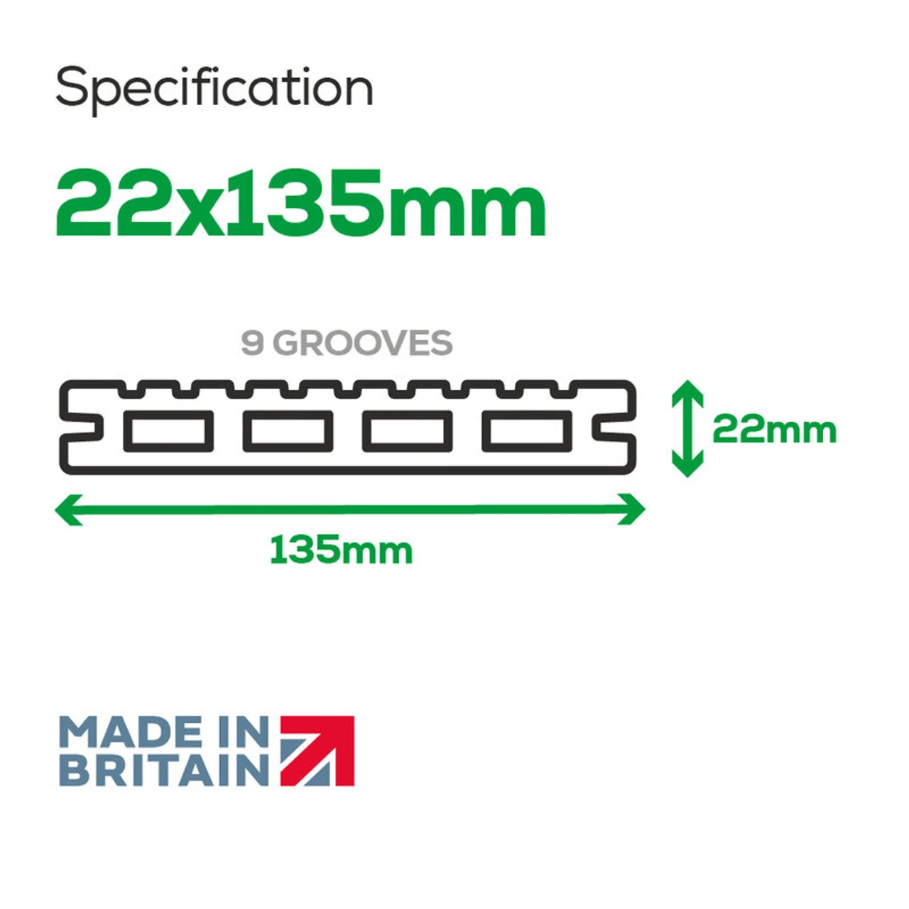 Great for outdoor applications and heavy foot traffic, Habitat+ is a wood plastic composite decking product that’s suitable for residential decking projects. Dual-sided and with HDPE capped coat, Habitat+ composite decking is as strong as it is attractive. If you are seeking a no-nonsense, low-maintenance deck board that allows you to spend time enjoying the sun, then this product is perfect. Hard wearing and robust, Habitat+ will allow you to focus on the creation of your dream deck. Each board has a height of 22mm and a width of 135mm ensuring consistent installation every time.