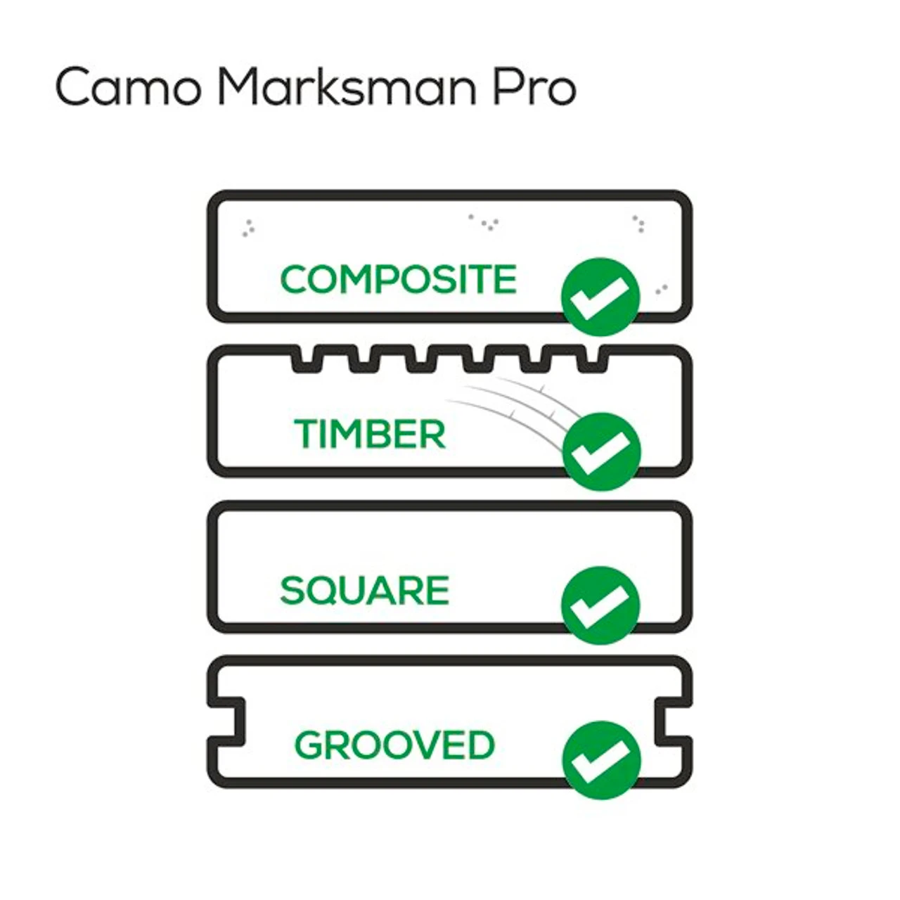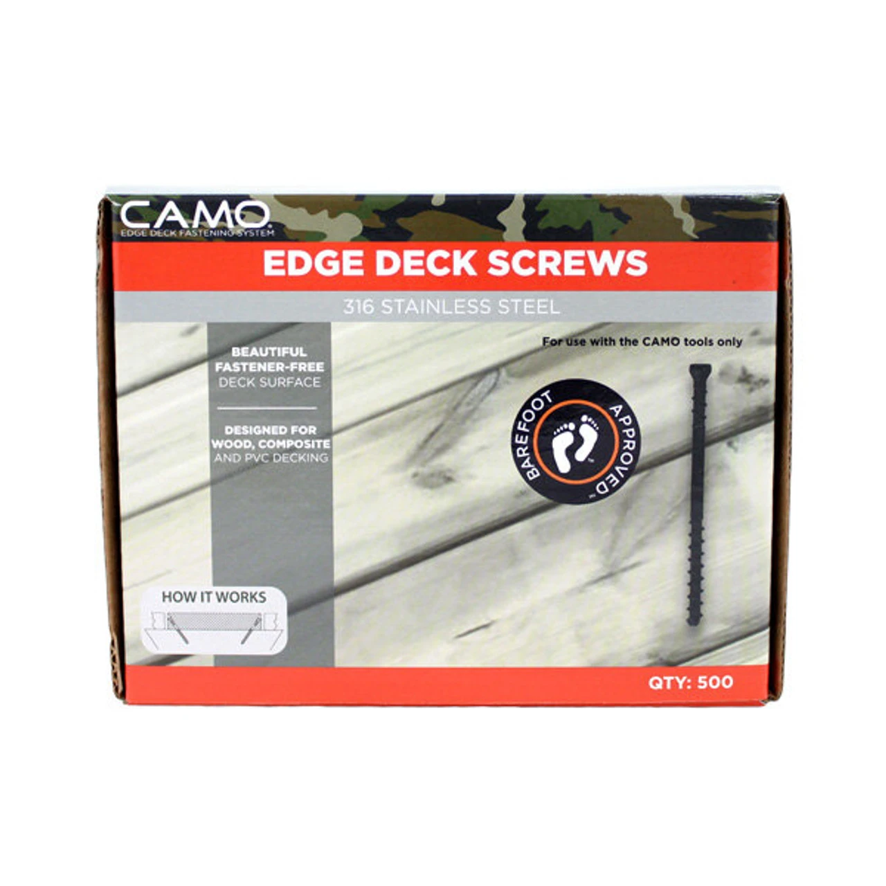 The 60mm CAMO Pack of 500 Stainless Steel Deck Screws have a Protech coating finish, and are suitable for use with PVC and composite decking as well as all types of woods that have a 32-50mm board depth, including hardwoods like balau and oak. Pre-drilling is not required when using most types of decking material, however if your boards are made from hardwoods such as IPE, Tigerwood, Ironwood or Cumaru we do advise pre-drilling. The stainless steel screws are ideal if you are installing decking around a swimming pool or if you live in a coastal area. For other common decking applications, we recommend using the Protech coated screws instead. The CAMO range is barefoot approved, so you don’t have to worry about your family’s feet catching any sharp screw edges during the summer months. Please note that only official CAMO deck screws are suitable for use with the CAMO Marksman Pro as they have been engineered to work together. Using products from other brands may not produce the highest-quality results. The box includes a driver bit, however grooved board driver bits can be purchased separately.