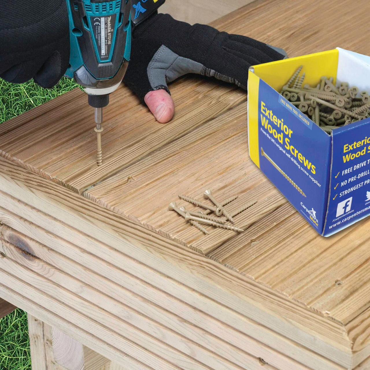 Carpenters Mate Decking Screws are extremely strong, outdoor wood screws perfect for use when installing decking. Featuring a self-countersinking square drive head that leaves it flush against the surface of the wood. The corrosion-resistant steel that they are manufactured from prevents corrosion and makes them suitable for all weather conditions. No pre-drilling is required when using the Carpenters Mate Decking Screw. Their pressure treated timber colour allows the screw to blend in with the colour of your pressure treated decking or timber. Pack contains 500 screws.