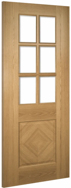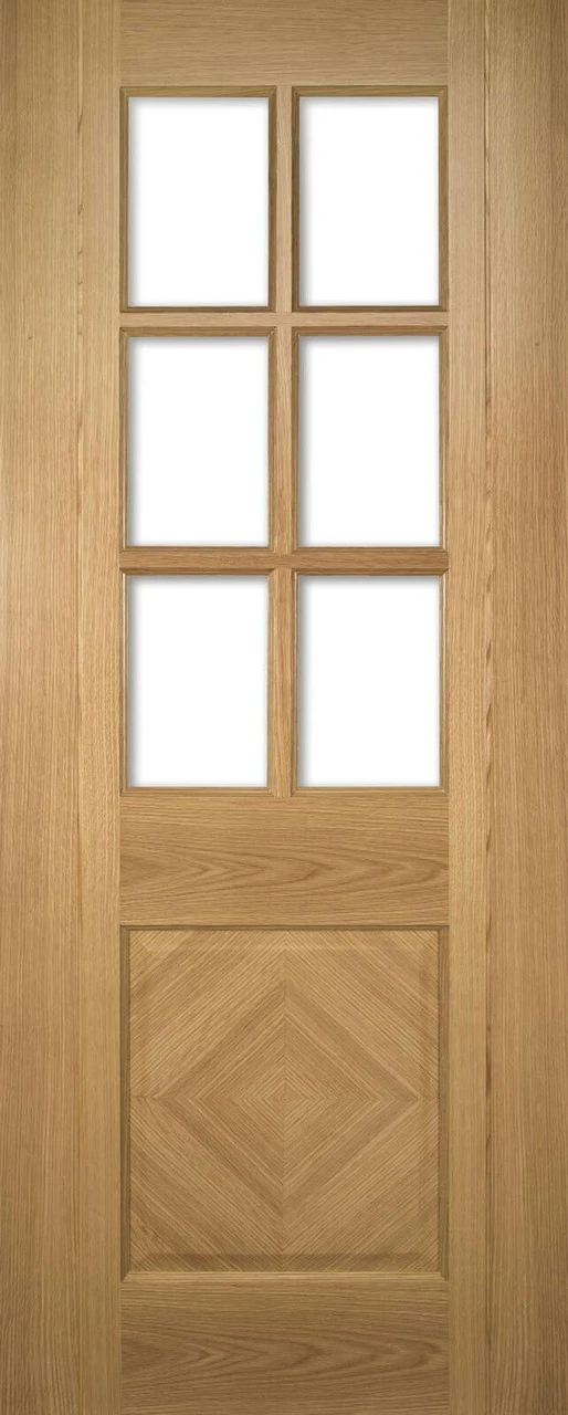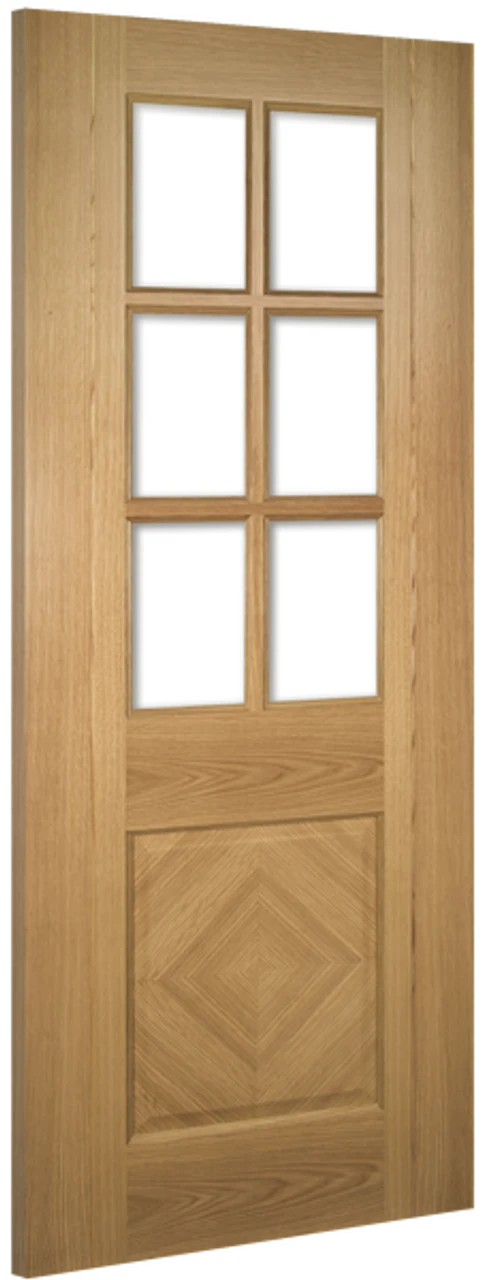 This elegant door is beautifully finished and ready for installation anywhere in the home. In the solid version, a rectangular panel of oak veneer occupies the upper two-thirds of the door, whilst in the glazed door, this section is fitted with six rectangular panes of clear, bevelled-edged glass. Sporting classic diamond match veneers, the Kensington Oak door adds impact and sublte sophistication to any room.