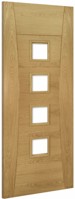 This unique door showcases the gorgeous crown-cut veneer of American white oak (Quercus Alba). Contrasting orientation shows off the grain pattern to its best advantage, and the contrast is strikingly accentuated by the gentle curves of the vertical veneers, which carve a subtle waist into the horizontals. In the glazed door, four square panes of clear, toughened glass are set neatly into the veneer panels.