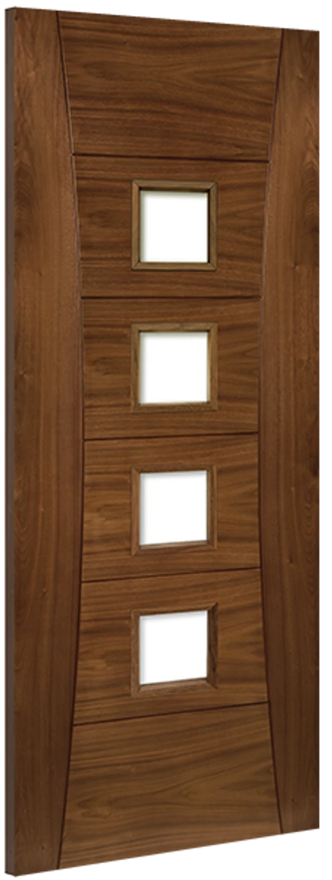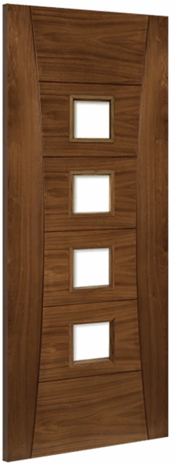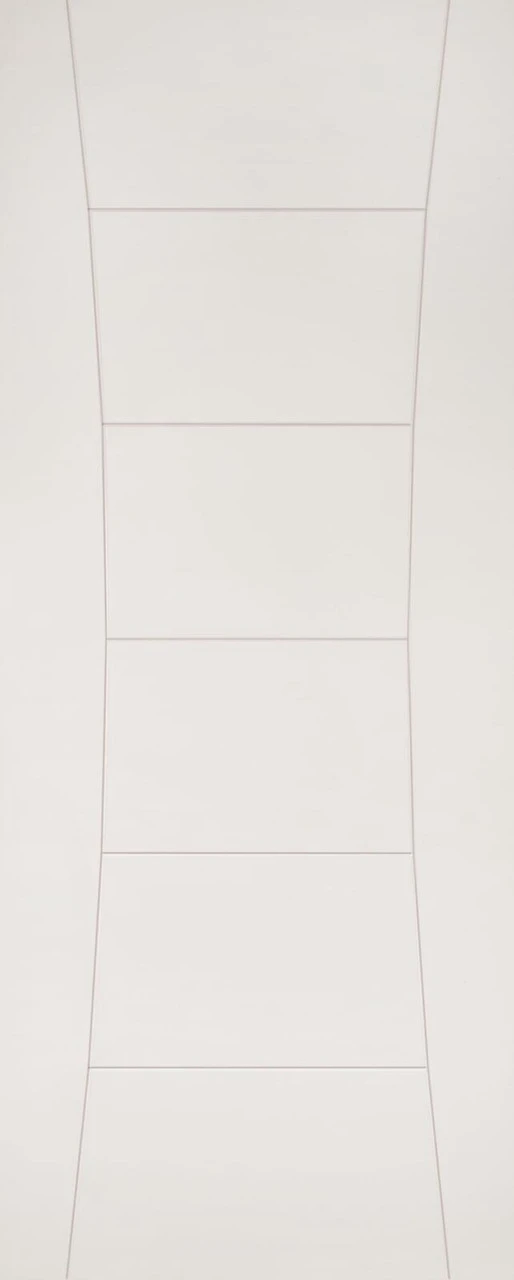 This unique door combines a clever combination of lines and curves. The perfectly spaced horizonal lines are strikingly accentuated by the gentle vertrical curves. Finish this door with a strong colour to make a bold statement or match the softness of the curves with a warm, neutral colour for a more subtle look. In the glazed door, four square panes of clear, toughened glass are set neatly between the vertical lines.