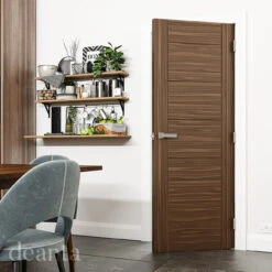 The rich grain patterns in this door’s crown-cut veneer highlight a striking combination of vertical and horizontal panels. The Seville Glazed Walnut door features a slim, vertical pane of clear, toughened glass that runs down the centre of the door, slicing through the horizontal panels. Like many Deanta doors, the Seville Walnut can be customised with bespoke glazing options.