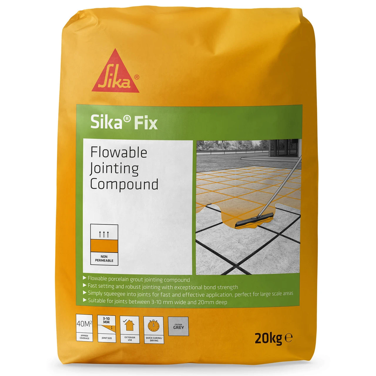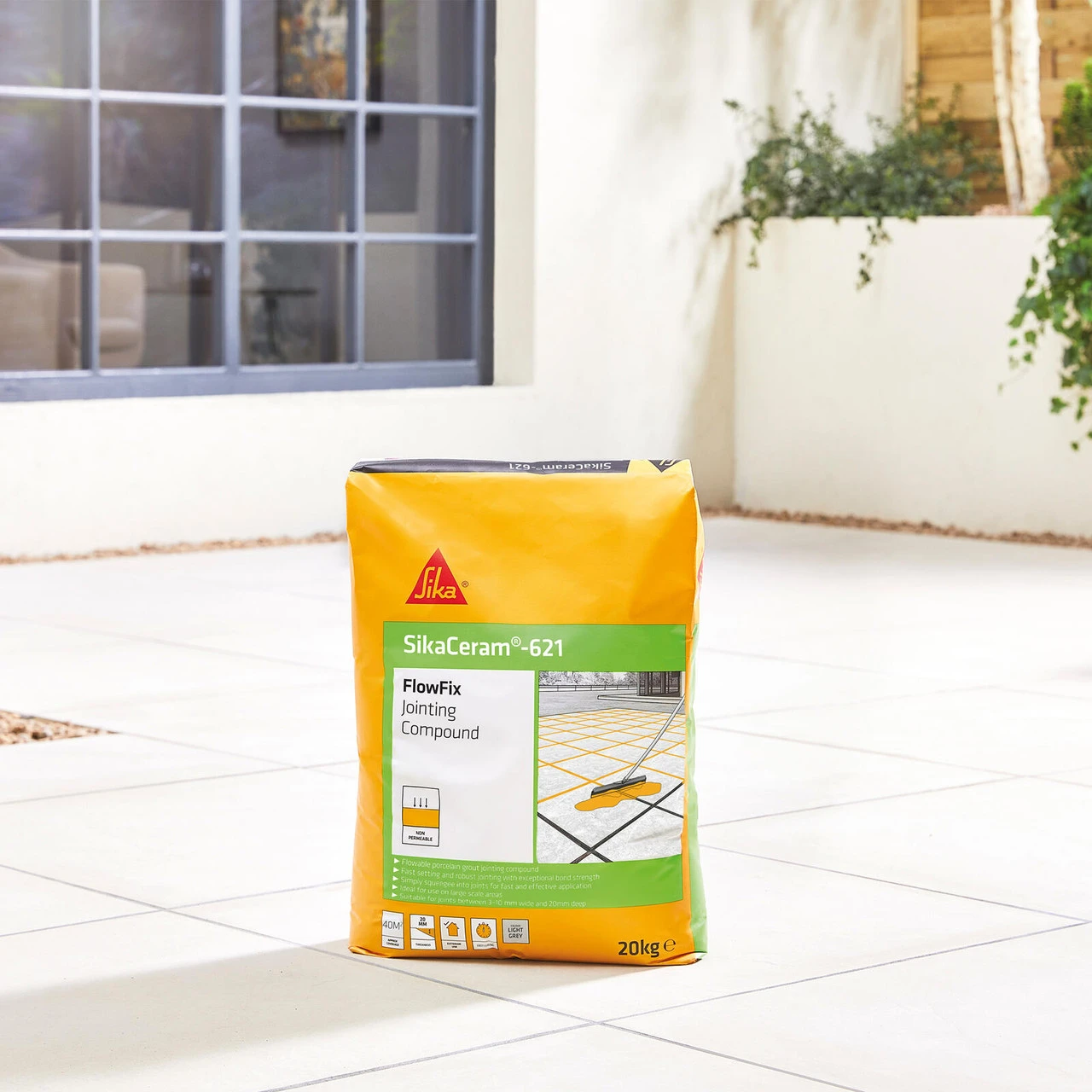 SikaCeram-621 FlowFix Jointing Compound is added to water to form a flowing joint filling and grouting compound. Quick and easy to use, it is designed for use with ceramic or porcelain paving, simply spread it into joints 3-10mm wide. It cures in 60 minutes to a non-permeable, light grey finish. SikaCeram-621 FlowFix Jointing Compound is a controlled, cementitious flowable jointing grout which is applied by mixing with water on site. It can be poured and worked into joints with ease and surplus is simply washed off after 30 minutes.
