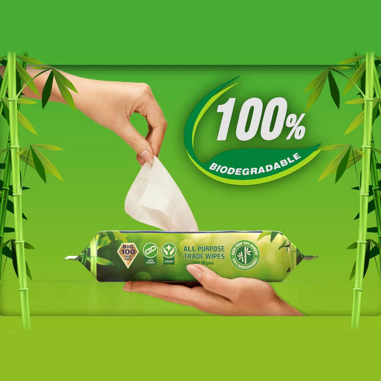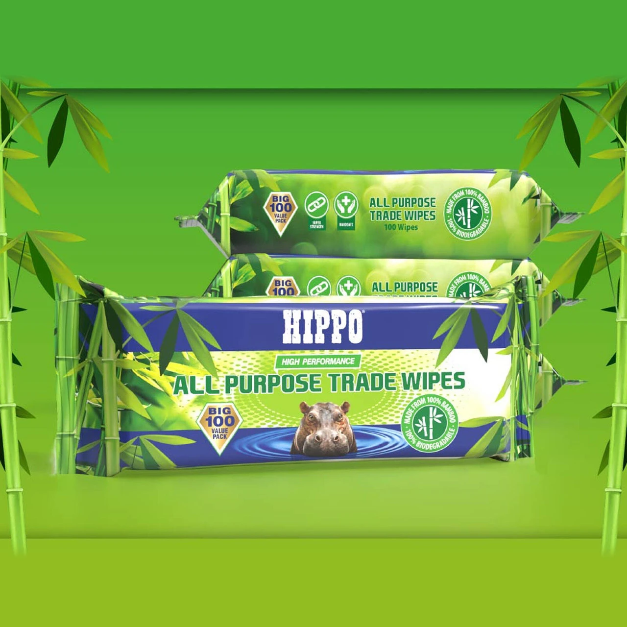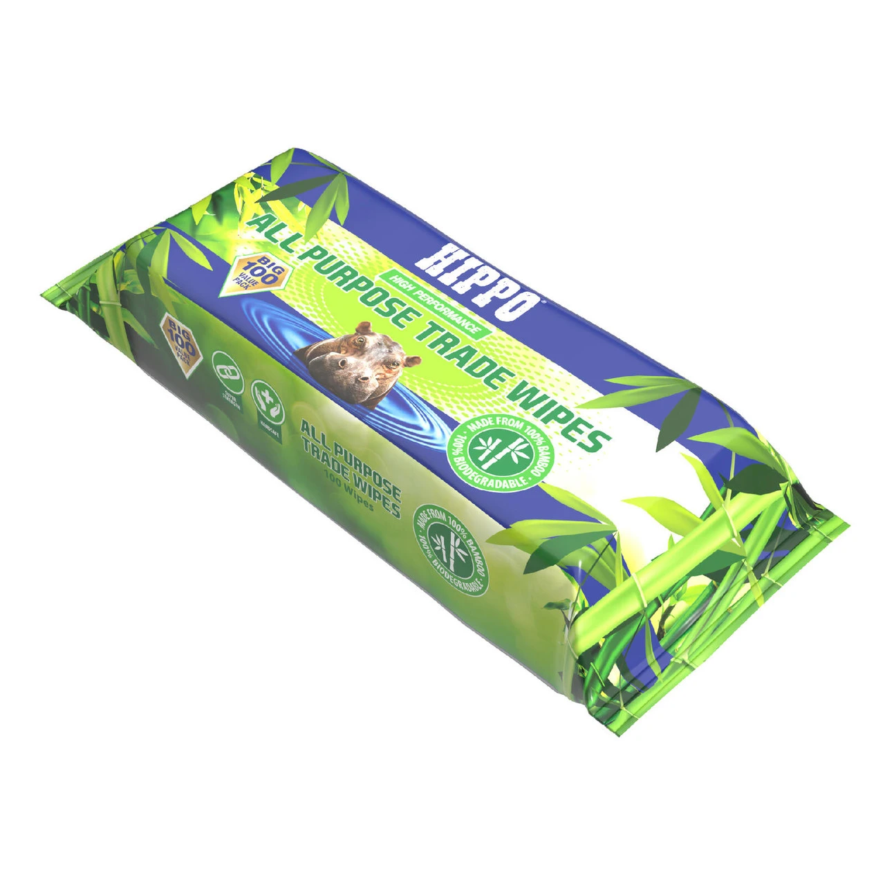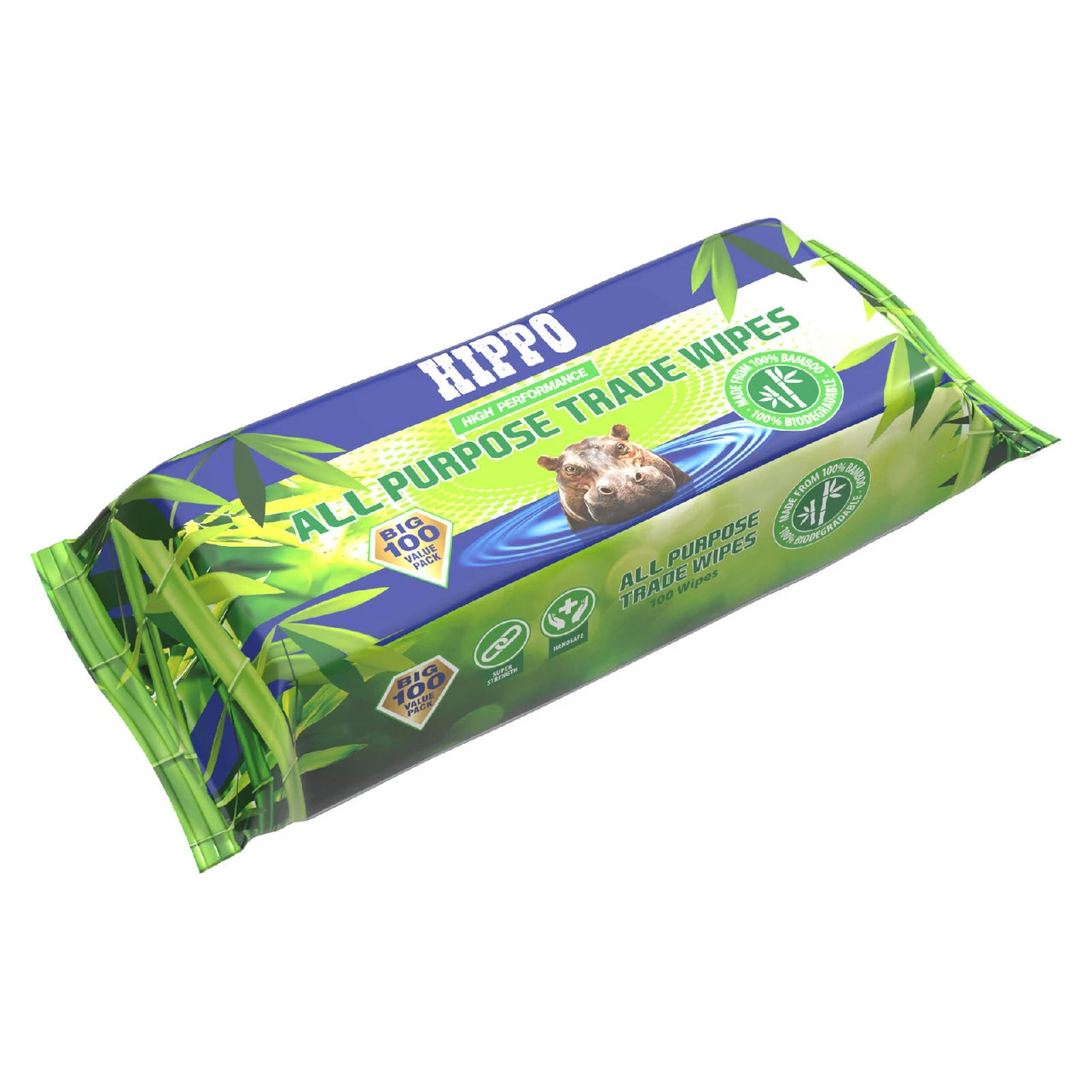 Hippo Bamboo All Purpose Trade Wipes pack of 100 are eco-friendly and effective in removing dirt and grime, as well as most paints, oils, and adhesives. It is a multi-purpose cleaning wipe that is both environmentally friendly and long-lasting.