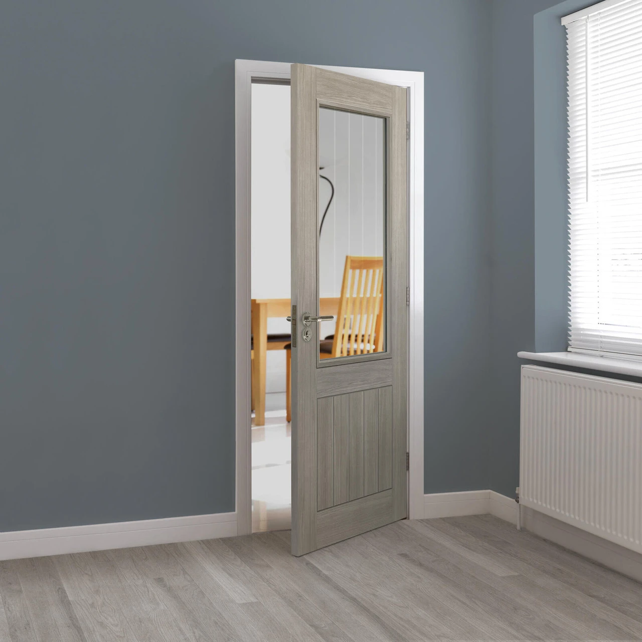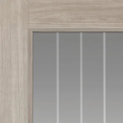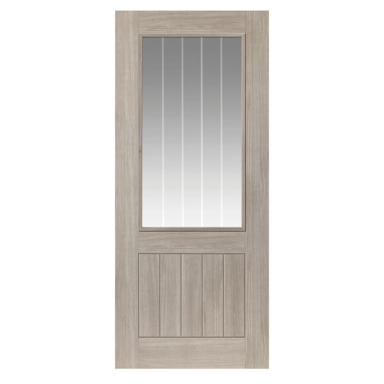 Cottage style grey laminate glazed door with grooved central panel, supplied fully finished