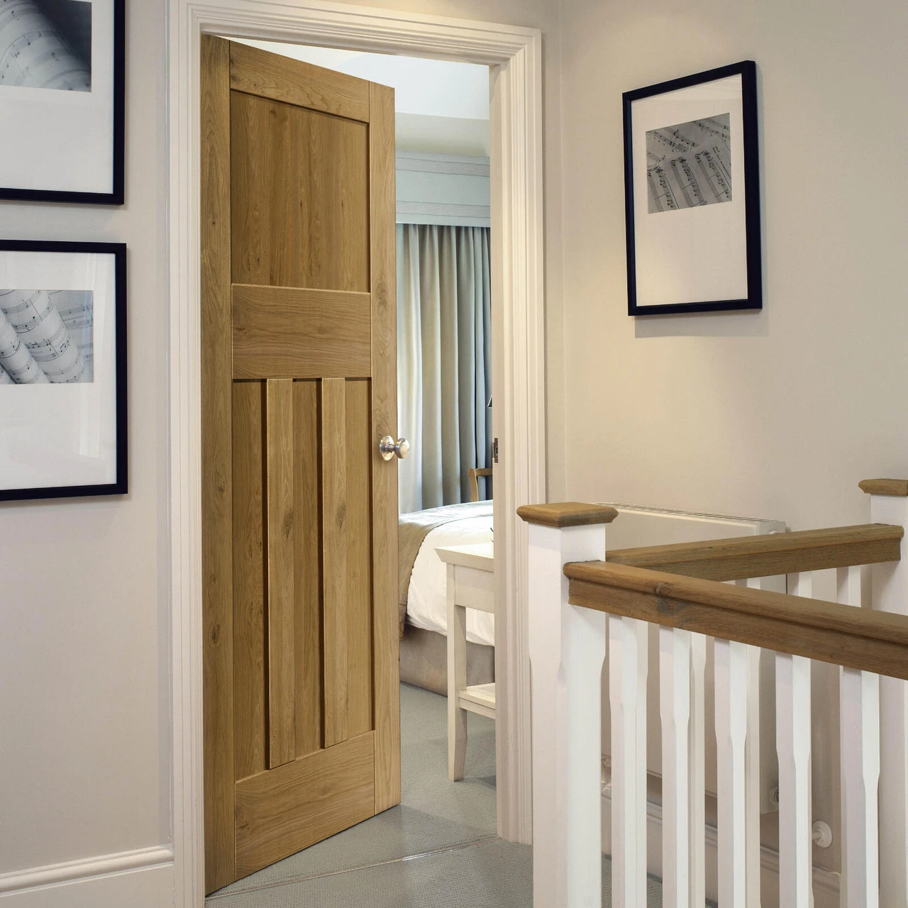 Rustic oak, naturally knotty in appearance 1930’s DX style interior door. Supplied with varnish finish.