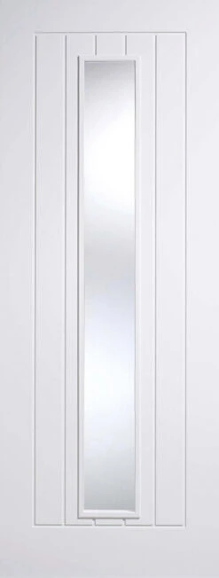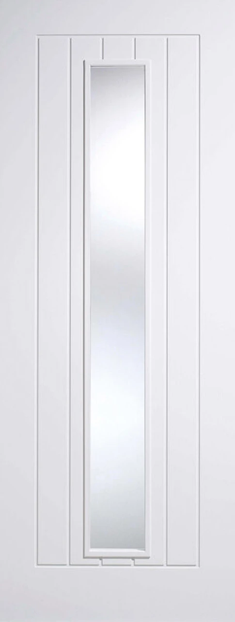 A large rectangular clear glazed panel is centred within grooved panels for this Mexicano door design, crafted from primed solid core in white.