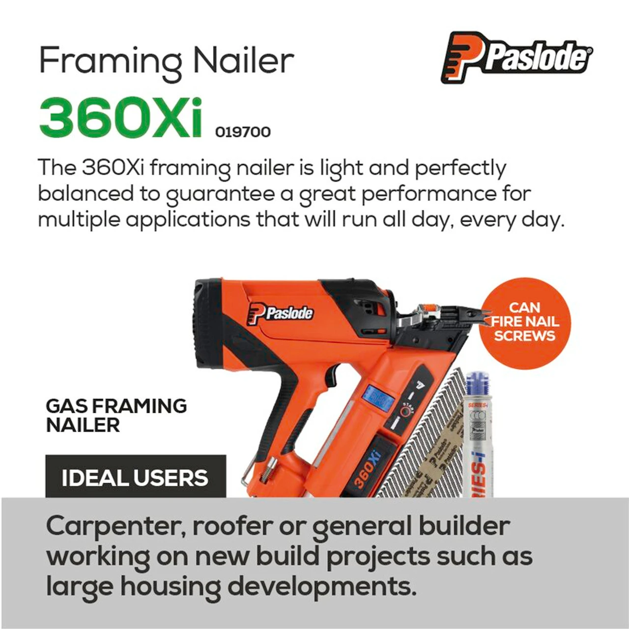 The 360Xi framing nailer is light and finely balanced, ensuring excellent performance in a variety of applications. A high-capacity lithium battery and waterproof fuel cells ensure that the tool will function all day, every day, regardless of the task. The ideal user for this framing nailer is a carpenter, joiner or avid DIY-er working on 1st fix new build and renovation projects. Applications would include: Roof battening, Truss work, Timber frame, Cladding, Stud work, Joists, Roof boarding, Flat roofing, Overboarding, Floor boarding, Panelling, Shuttering, Decking, and Hoarding work. The 360Xi nail gun has a lot of similar fixing and finishes with the IM350+, but they’re not compatible with each other. The 360Xi is more powerful, boasting 105J. 360Xi uses newer series-I fuel cells, that are guaranteed to work in all weather, including up to -15 degrees Celsius. It can also produce more shots per battery 360Xi 13,000 shots vs the IM350+ performing only 9,000. However, the Paslode 360Xi can only use our rfid fuel cells.
