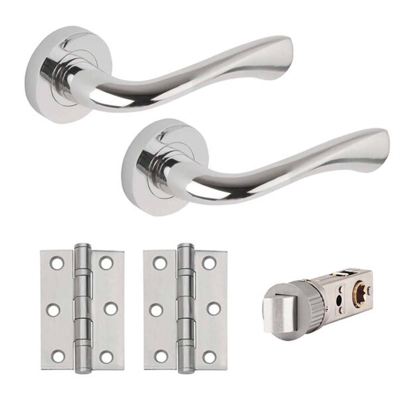 The Zone Privacy Door Pack contains a pair of levers with privacy functionality on round roses with a dual polished chrome plated finish; a pair of satin stainless steel 3′ x 2′ ball bearing butt hinges and a 76mm Smart Latch with a dual satin nickel plated and satin stainless steel finish. The pack is ideal for use on budget moulded or composite doors where privacy is needed, such as bathrooms.