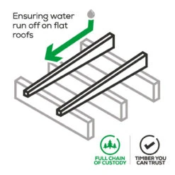 Softwood timber Firring or also known as tapers are strips of timber (or a batten) that has been cut at an angle along its length diagonally so that it tapers, with one edge being deeper than the other. An ideal solution for flat roofs as it will allow you to create a slope or fall in your flat roof to help rainwater off, preventing pooling or flooding and protecting the integrity of your roof. The fall of these timbers are 40mm to 3mm across the length of 3.6m. Timber Firring strips are usually made from softwoods such as spruce from Germany or whitewood from Sweden. Using a softwood ensures that they are easy to attach, fix into position and can be cut down to size and fitted onto your roof joists to create a stable and uniform slope, providing they are set level so that the ceiling is even before any boards are laid. It is important that all cut ends are re-sealed with a proprietary treatment. Firring or often spelt furring, are usually cut in pairs, and in order to minimise waste, pieces on either side of the cut line are used.