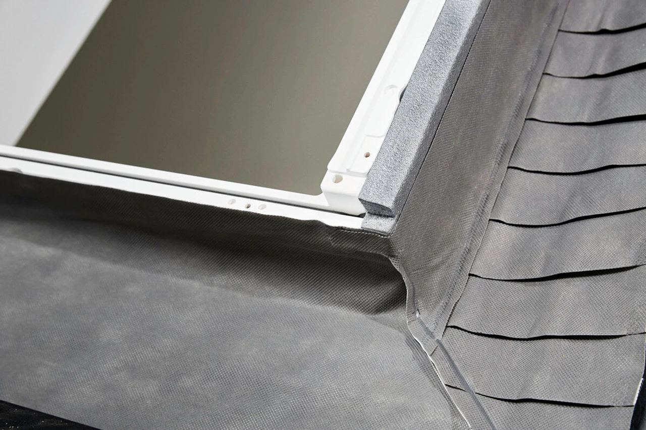 An underfelt collar by Velux that ensures the perfect fit and a watertight seal between the roof window, batterns, and the roofing underfelt. Includes an adjustable drainage gutter to lead water away from the head of the roof window.