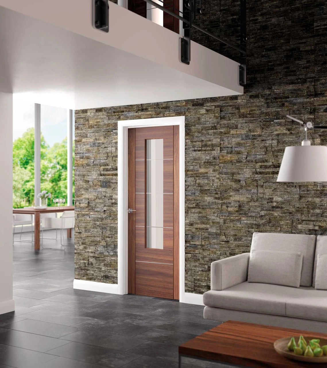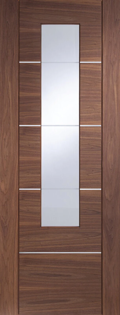 A contemporary fully finished Walnut door with horizontal panels and real aluminium inlays. The fully finished Walnut Portici blends contemporary horizontal grain with real aluminium inlays to create an impressive looking door that would bring a touch of class to any home. A clear glazed panel in the centre of the door allows for light to be transferred from one room to another and the intricate etching gives this door a real sense of style. Fully Finished in a clear AC lacquer and ready to hang. Complementary panelled and fire doors are also available in the range along with an Oak alternative.