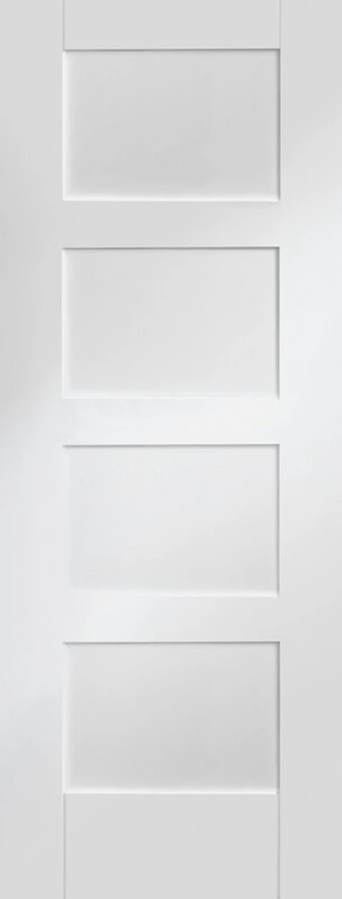 A versatile white primed 4 panel shaker door. The Shaker door is a contemporary 4 panel design. Although contemporary in styling this is a door that would not look out of place in any home. This door can be mixed with other complementary doors from the range such as a fire door, a glazed door or a bi-fold door to help create a stunningly consistent look in any home.