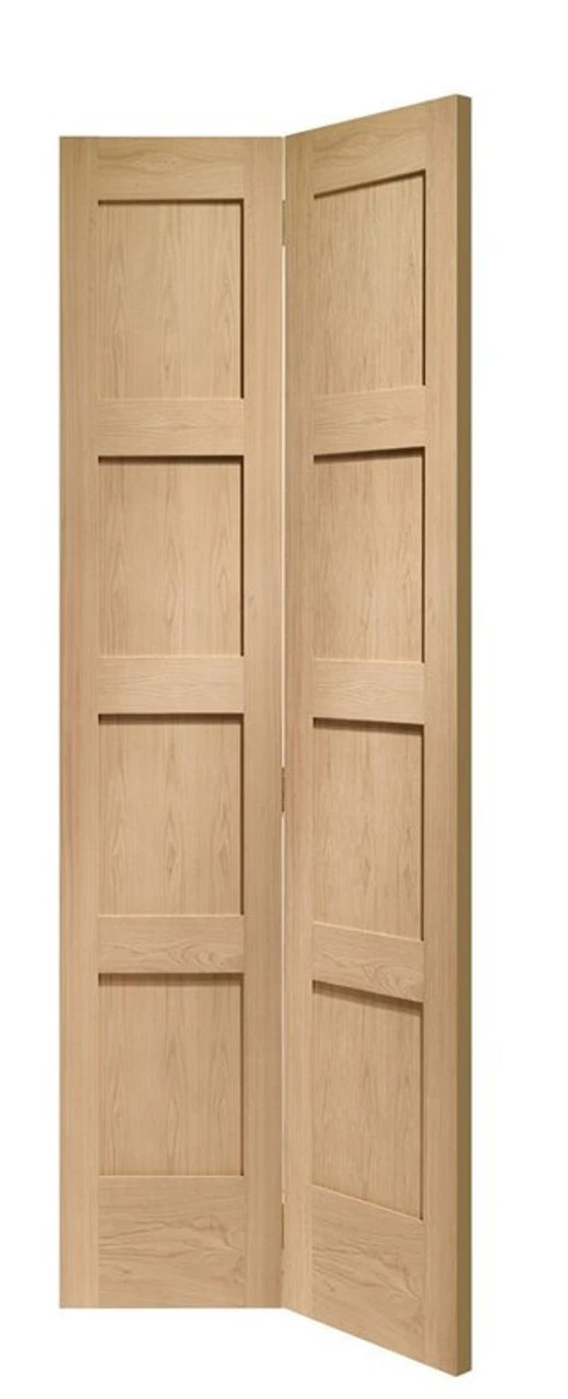 The Shaker internal oak door is available in this glazed Oak Bi-Fold design. The clear glazed Shaker 4 light bi-fold door is perfect for adding some well needed natural light to areas that might be limited for space and cannot fit a full sized door, like cupboards, closets and wardrobes. Part of the extensive shaker range matching panelled, fire and different glazed doors are available to ensure this door can be mixed with other door types to create a consistent look within the home.